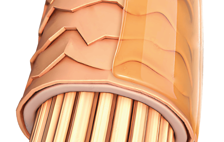 A camada protetora externa da fibra. Como escamas de peixe, as células achatadas se sobrepõem para defender o interior da fibra de danos, como poluição, radiação UV e processos químicos.